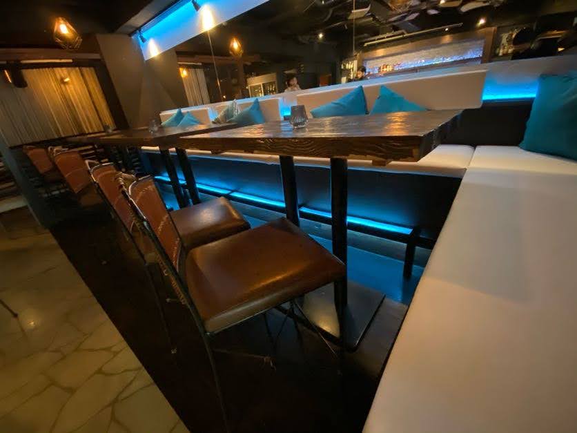 カウンターの後ろ側のテーブル席はハイテーブルに変えました。