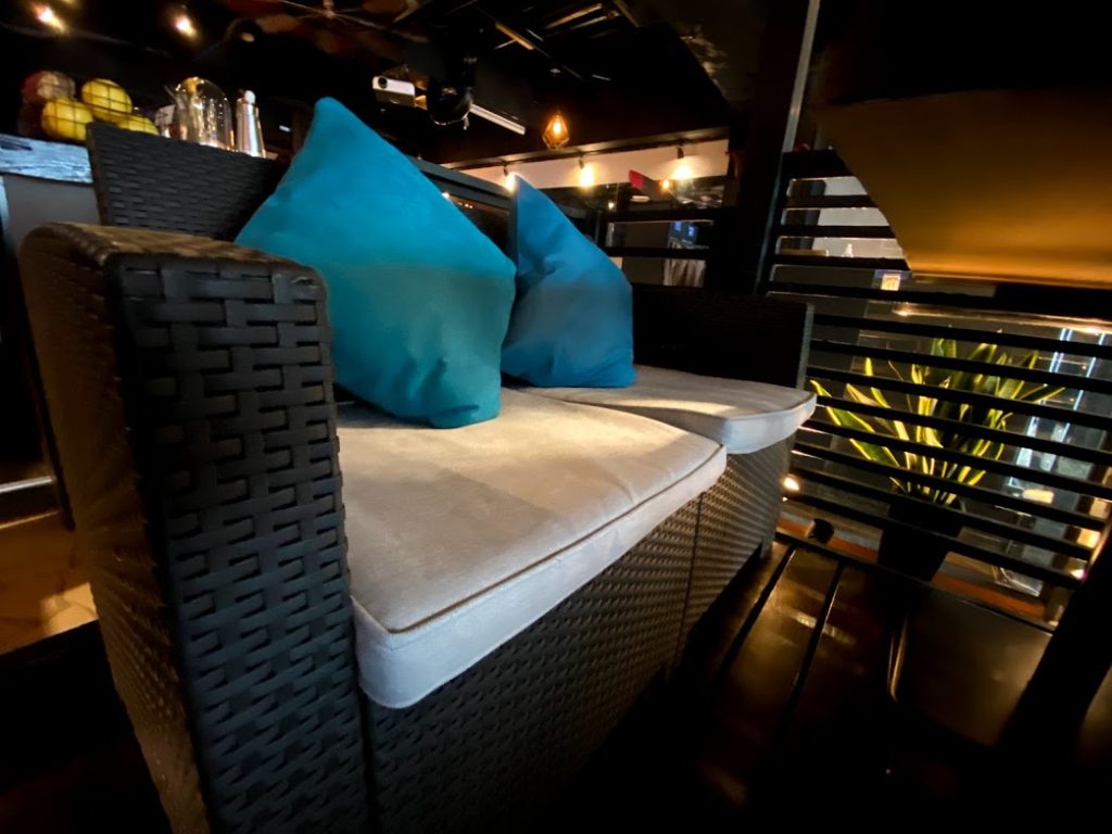 ウッドデッキのテラス風の席は、マットブラックのラタンのソファとターコイズのクッション